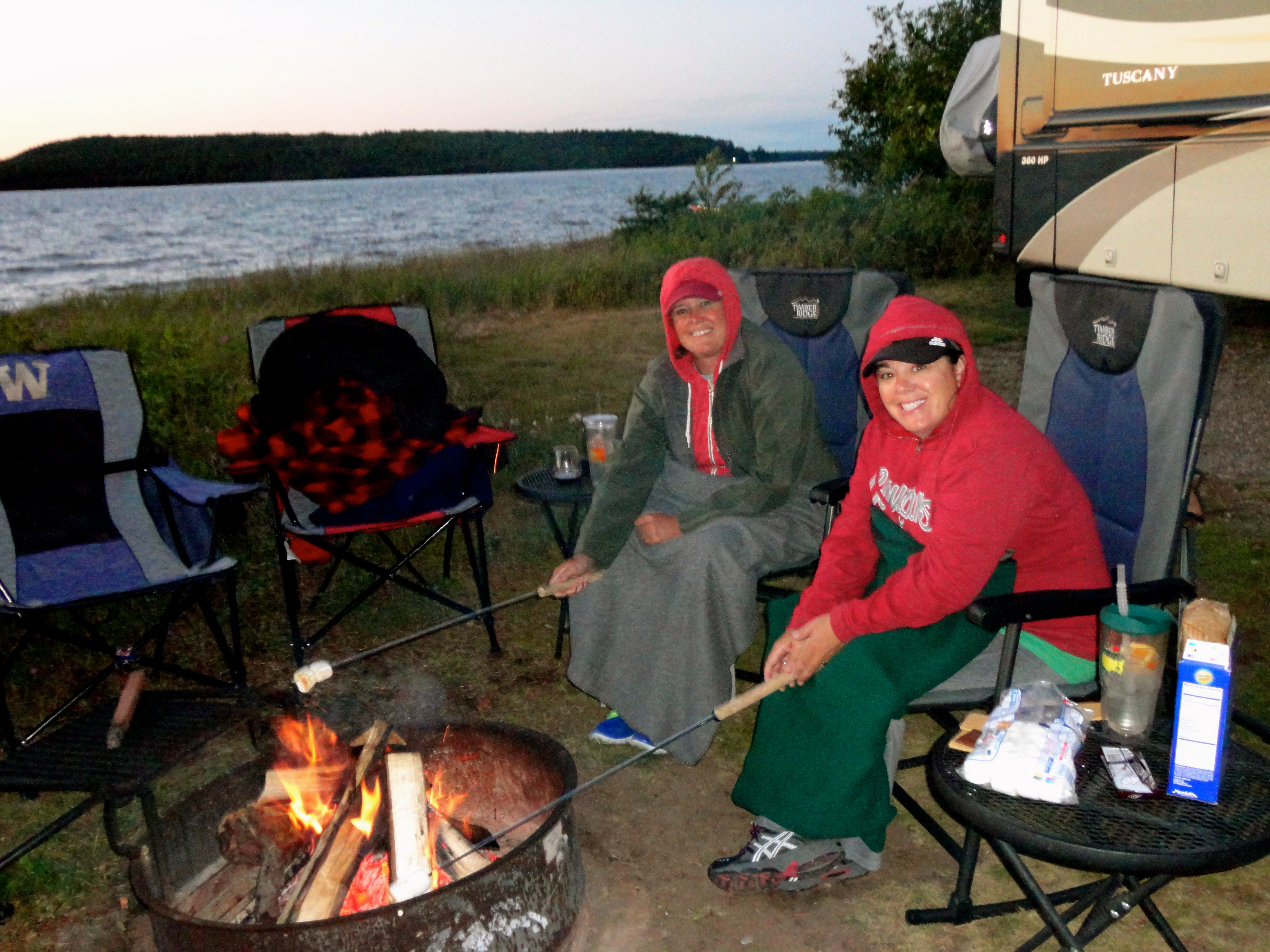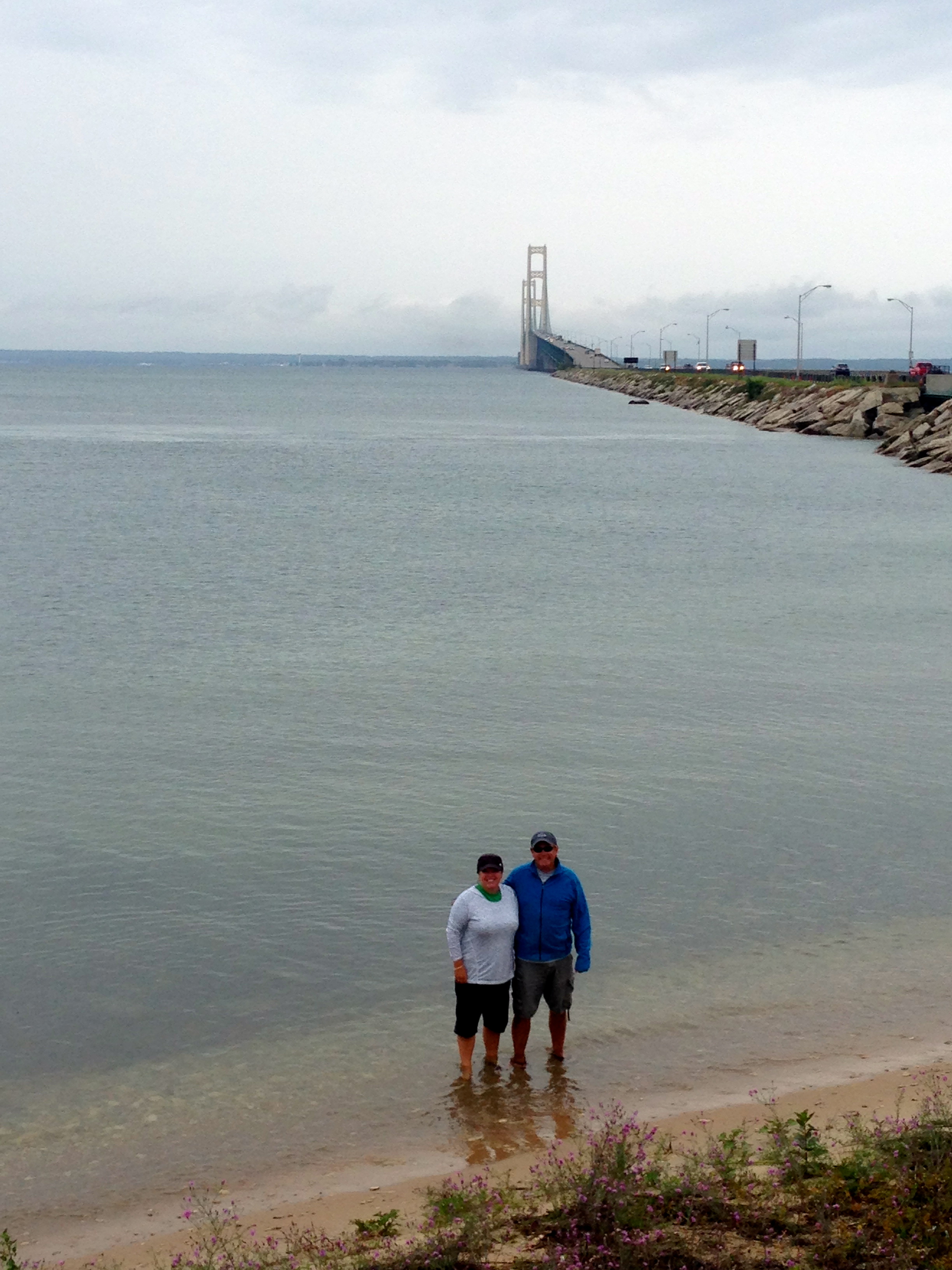 We woke to some rain and after getting absolutely soaked packing up the rig and hooking up the car, (worst rain we have ever had to pack up in over 15 months on the road) we started towards the Upper Peninsula of Michigan. The trip was to be about 5 hours, 250 miles. As the drive went, it was a bit more challenging than I have had in a while, intermittent rain, with some strong winds, it kept my full attention for sure. The highlight of this drive was the crossing of the Mackinaw Bridge, connecting the two portions of Michigan, and separating Lake Michigan from Lake Huron. After paying the toll to cross the span, we pulled over to the visitor’s center right next to the tollbooth, and parked the MoHo. Knowing our next destination was on Lake Superior, this was the only chance Traci and I would have to step foot in Lake Huron. Windy and cold, we walked the 150 yards down through a maintenance center, to the edge of the lake and dipped our feet in the icy cold Lake Huron, 4 down and one more Great Lake to go! We returned to the MoHo, and made our way to our destination, Munising Tourist Park, on the edge of Lake Superior. We had a great site, backed up to the waters edge. Traci and I had worked tirelessly to get this specific site at this park, as we wanted the Pflu’s to be able to enjoy the lake views we knew it would provide. Exiting the MoHo, and bam, right in our face was the same wind I had battled on the drive. We guessed it was at least an 18-20MPH breeze, right off the lake. Add to it that it was about 60 degrees out, and you can imagine what a shock to all of us how cold it really was. We weren’t expecting this type of weather. We got set up and headed out to the town of Munising and had another linner at a little bar in town. Needing some groceries, we hit the local market, loaded up and returned to the MoHo. The wind had eased a bit, and we did our best to make a fire and stay warm outside for the evening, but the wind did not cooperate.