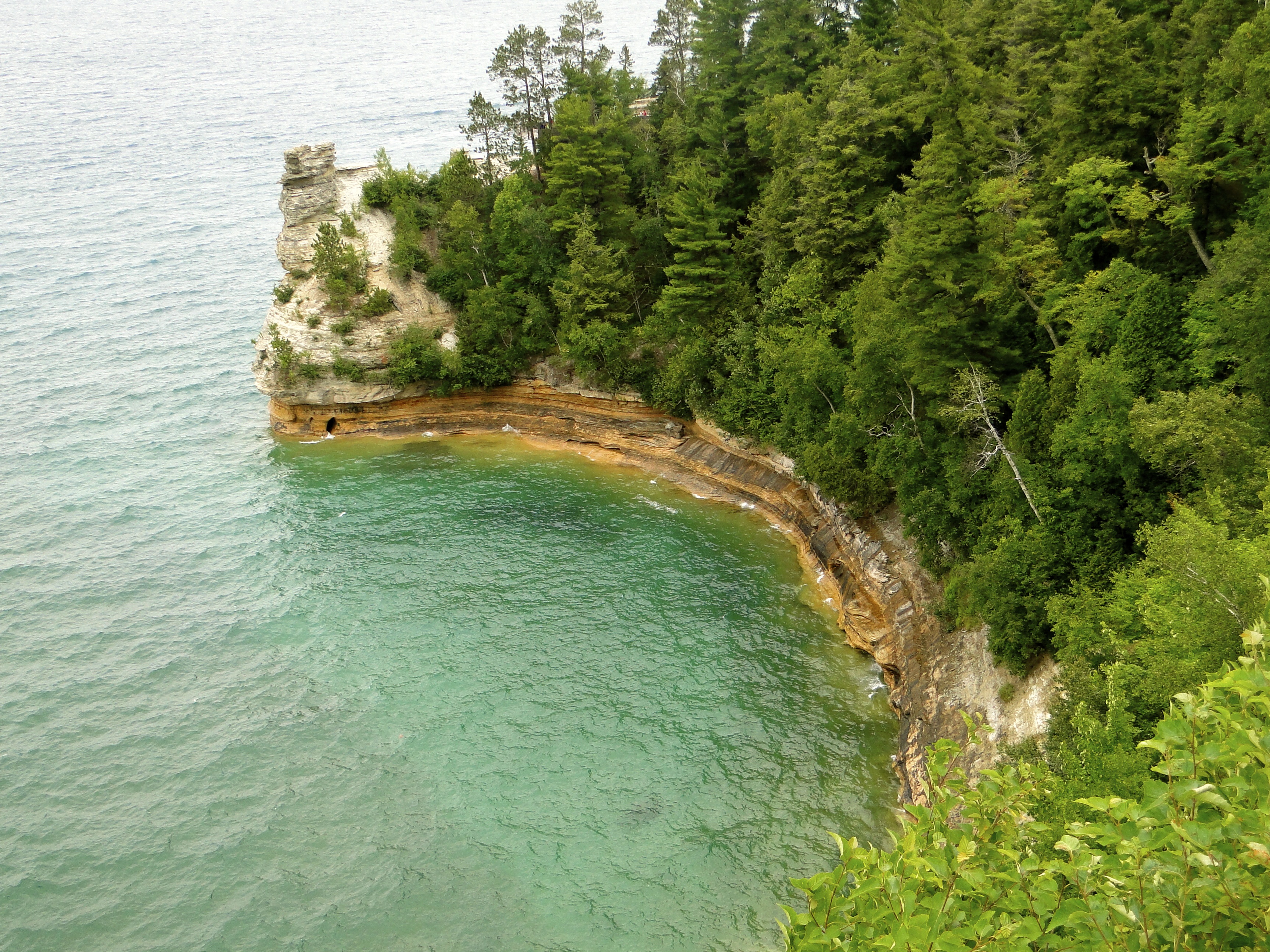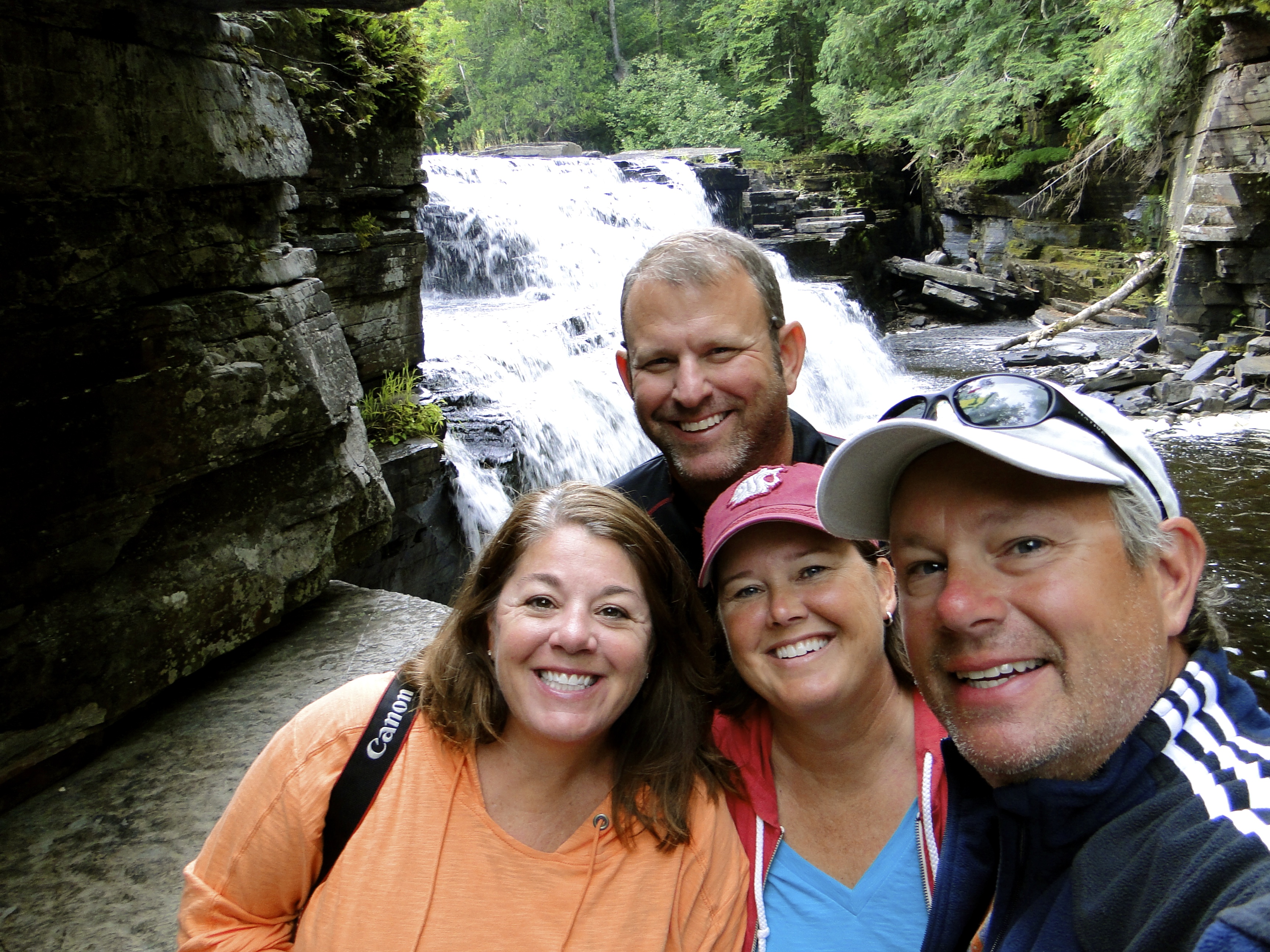 The next day we tried to reserve a pontoon boat for the afternoon to see the bay and cruise the Pictured Rocks National Lakeshore. The colorful sandstone cliffs are best viewed from the water, so we tried to line up a ride to explore ourselves. There are a couple tour boats that have 250 people on them, not the way we wanted to see the sites, and unfortunately everyone else had not gotten the memo we were in town and all pontoon boats were rented. Plan B. We picked up Pasties, the local specialty of a meat and veggie filled pastry, and drove out to the National Lakeshore. The Pasties were just OK, nothing we needed to try again. The lakeshore was much better. We walked down to the overlook at Miners Castle, and had a nice view of the Pictured Rocks. It would have been better from the waterside, but this view was still pretty spectacular. We drove down the road, stopping at a waterfall area, and then along the northern shoreline of the park. We stopped at a viewpoint along the lake and headed down the beach area. There were tons of smooth little rocks along the shoreline all with great colors from the minerals of the area. Traci and I decided this was the spot for us to set foot into Lake Superior, and with our toes in the water, we had completed the fifth and final Great Lake challenge, something we both had never expected we could do in our lifetime. The water was a chilly 53 degrees at surface and 37 degrees 3 feet below surface! Lake Superior is the largest fresh water lake in the world and is just mammoth! We continued up the road, and our next stop was the Log Slide overlook. Shelly had found this place during some research. On our walk out to the shoreline area, someone said it was worth the journey, but stay up high, it was a long way down. Again, not knowing what we were in for here, we crested the little dune, and wow, what a view! We were probably about 175-200 feet above Lake Superior, and the huge sand dune lead straight down to the waters edge. There were a few brave souls that had run down to the water, only to have to spend the next 20-30 minutes climbing back up the steep dune. We opted to stay on top, took several pictures and enjoyed the view, knowing we did not want to put ourselves through a grueling hike up a dune again. We were now about 10-12 miles from Grand Marais, so we continued east, and found the “little gem” of the Upper Peninsula. A tiny town, with only a couple options for dinner and we landed at the Lake Superior Brewing Company. Tired and hungry, the beer and food was great, just what we needed. We made our way back to the MoHo, about a 75-minute drive, taking the less direct route, staying away from the 198 curves we encountered on our way up. Marc and I made a fire in the windy night while Traci and Shelly watched a movie, and we hit the hay a bit earlier than the previous nights.