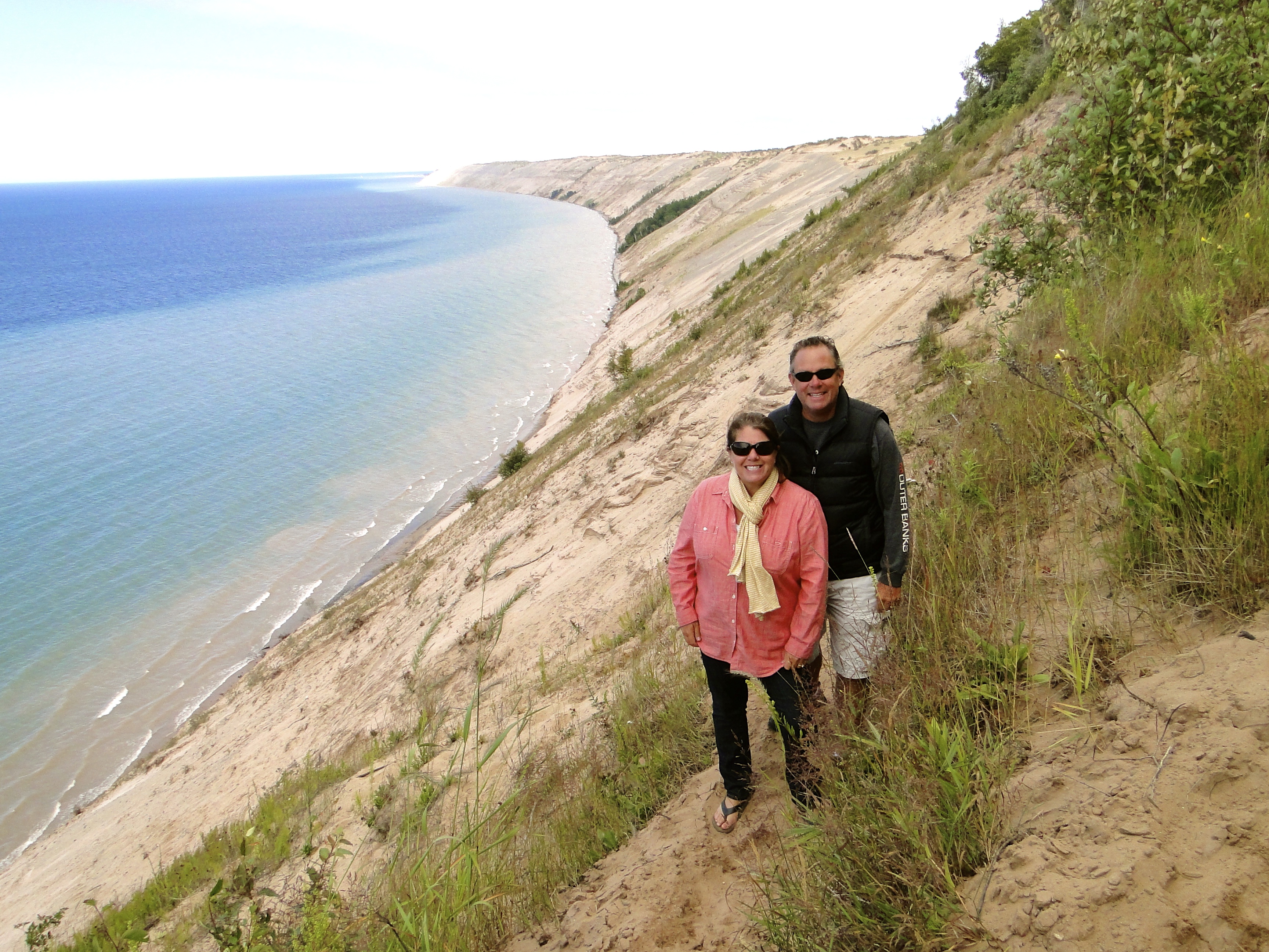 We slept in the next morning and had a nice breakfast before heading out for the day. Our destination was the Sleeping Bear Dunes National Lakeshore, on the east side of Lake Michigan. We stopped at the visitor’s center and got a map of the area. It was a quick drive to the dunes area, along with hundreds of others that day. When we finally got parked, it was sort of odd, a massive wall of sand in Michigan? We watched all the people running down, and climbing around and decided to head up ourselves. Now sand is great on the beach, but hiking up it, not so simple. We all were shocked how difficult it was to move, especially up hill. We finally reached the crest of the hill we could see from the parking lot, only to realize it was just the first of several hills in this massive dune complex. We trudged around for an hour or so, and took several photos, before returning to the car, quite tired and ready for a beverage. Next stop was a little beach up the road and a dip in Lake Michigan. This was the third Great Lake for Traci and I, and it felt great to cool off after our hike in the Dunes. Hungry, we found a little place for linner (late lunch, early dinner), and then down to another beach just at the top end of the National Lakeshore area. We had this place to ourselves, just relaxing on the “ocean” of Lake Michigan, enjoying a beverage, and watching the waves, a pretty awesome day all around!