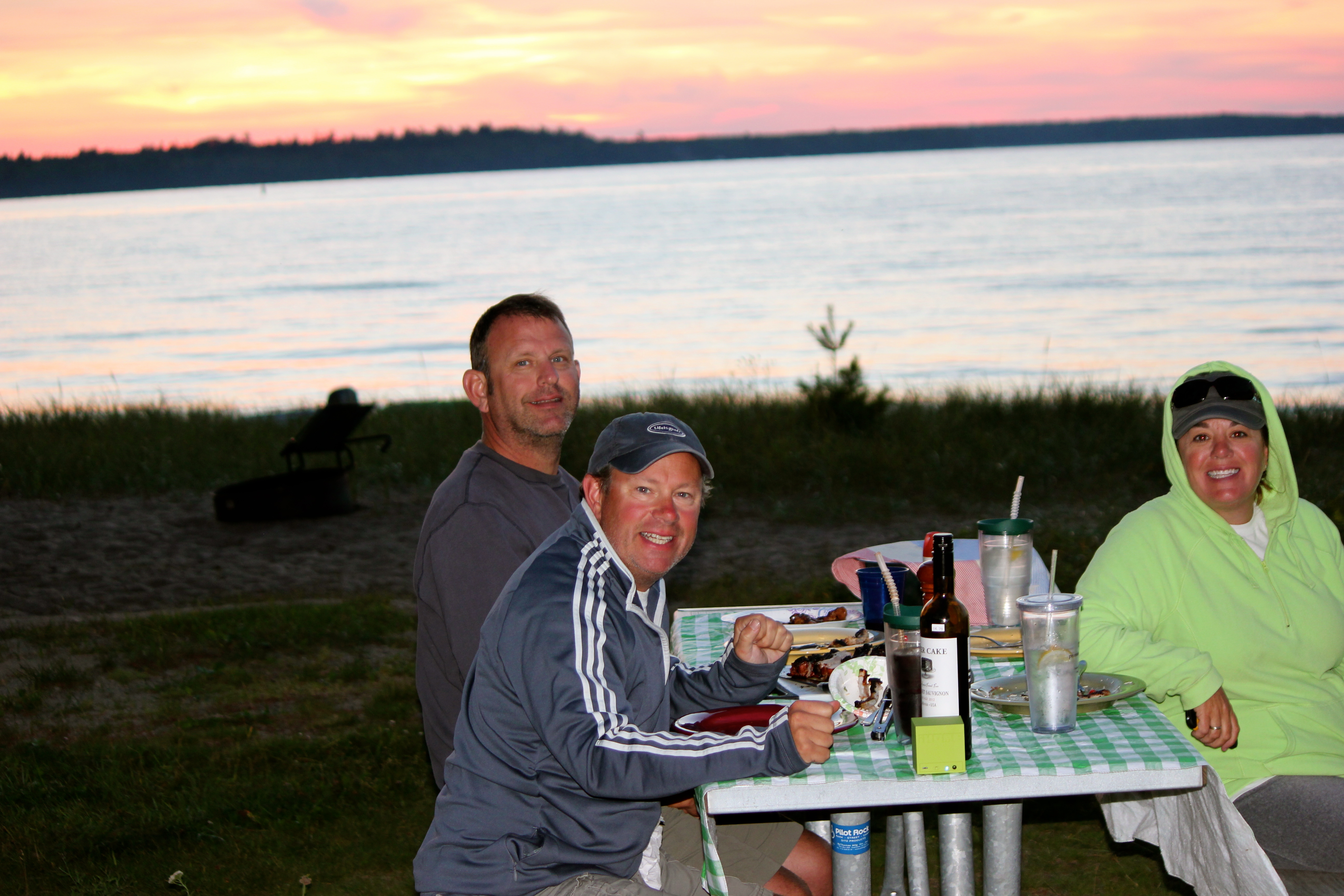 We woke the next morning, hoping our pontoon boat reservation might hold, but again the wind won out. We decided to head to the beach, just northeast of Munising, and hopefully somewhat protected from the wind by a local island. We set up our chairs, opened up the cooler, and relaxed on the breezy, but beautiful beach. We watched the tour boats and kayakers battle the wind, and were thankful we did not head out on the water that day. The views were great, and it was a very quiet relaxing day as the beach wasn’t too crowded. We returned to the MoHo, and the wind was really settling down. Marc and I grilled out on the open fire, Shelly made her artichoke and Parmesan crusted bread appetizer, and we all enjoyed a great meal outside at the picnic table watching a wonderful sunset. A spectacular ending to our time in Munising, so wishing the weather had been better the first two days. This is an amazing part of the U.S. that few people probably get to, but one I would highly recommend.