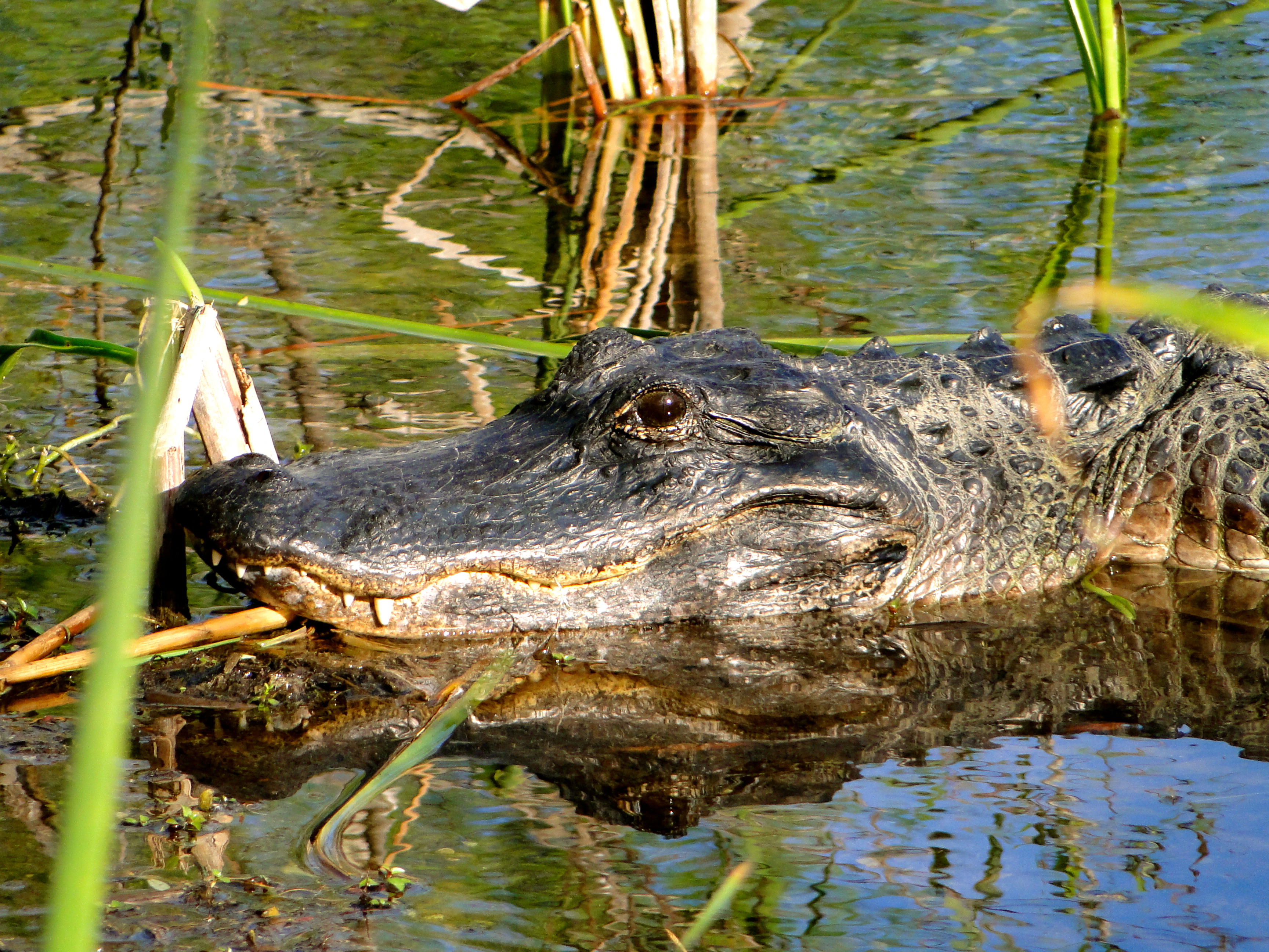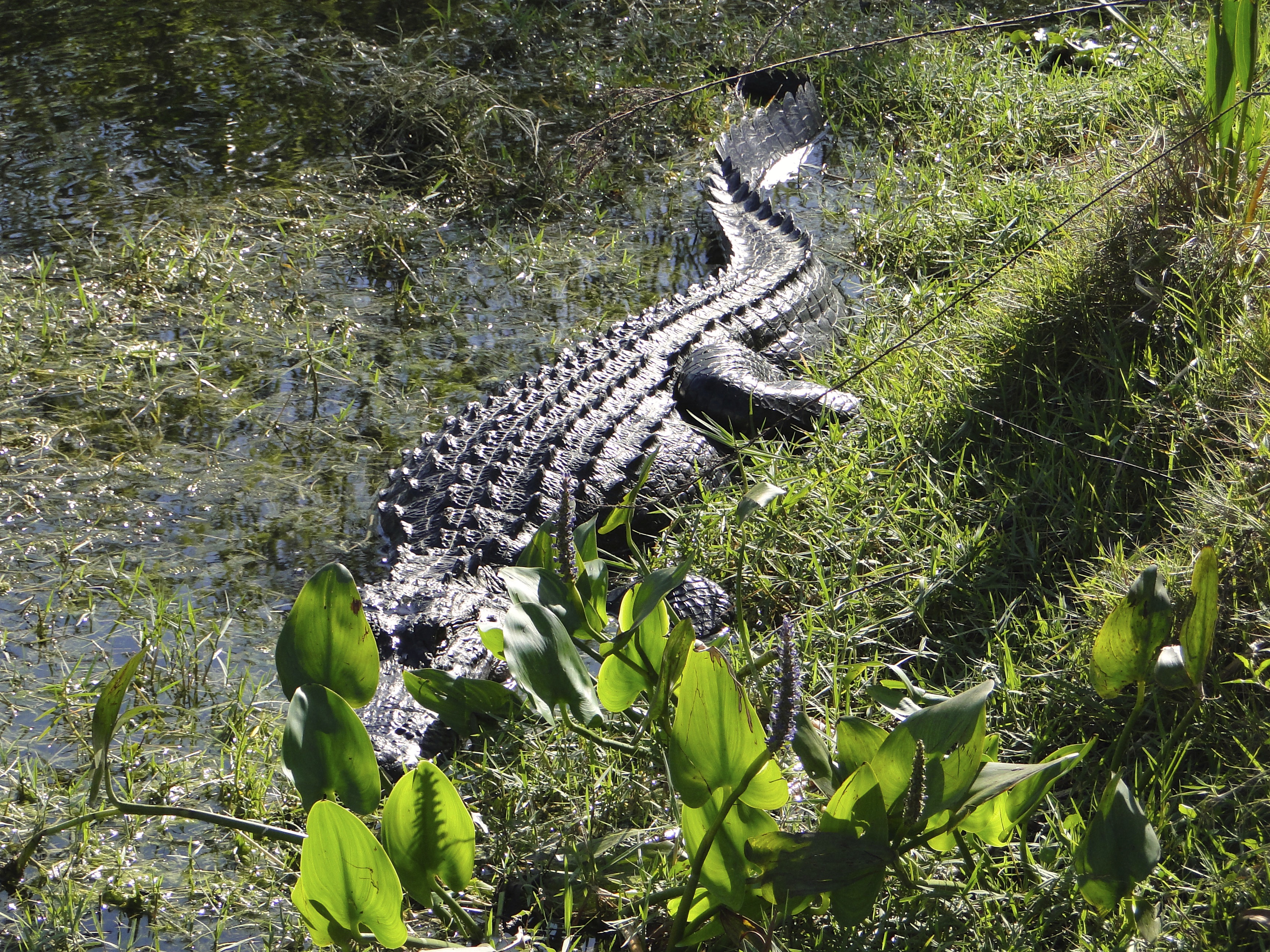 Sunday we woke and it was much better weather. We relaxed in the AM and headed to a Cuban restaurant for lunch, just down the road in the next little town of Chokoloskee, another recommendation. For the afternoon, we opted for a drive one our neighbors had told us about to see some alligators. We turned off Hwy 41 onto Turner River Road. There was a viewing dock set up for people to watch for alligators, birds, etc. We walked out on the dock, and there was not much to be seen, except for a ton of fish in a little wetland. (The Barron River we were staying on is very dark in color, as it mixes with the tides and the Mangrove leaves. These leaves stain the water a brown color, much like a tea bag, and it never is clear to see into). It was nice to see into some water, and actually see the fish swimming and all the plant life. We walked the length of the dock and thought we could see a small alligator off in the distance, but were not sure. Across the road about 50 yards, there were a few people making a bit of noise, so I headed over to see what was going on. Low and behold, there was a gator over there. I peered down to the area people were pointing, and this dude was huge! I would guess it was 13-14 feet in length, and that is no fish tale! (One lady nearby said she was a lifelong Floridian and had not seen one that big ever!) I positioned myself around the monster for some great pictures, keeping a safe distance, using the comfort of a bridge to view him sunning himself in the warm afternoon heat. We returned to the car and headed north on Turner Road. Alongside the road was a canal/river. We saw hundreds of gators, dozens of turtles, and all sorts of huge birds. Many of the animals were just sitting on the rivers edge, as if they were posing for us, pretty amazing how much wildlife was here. We completed the 17-18 mile drive and headed back to the RV park, a great side trip and can only thank our fellow RV park neighbors for the inside tip.